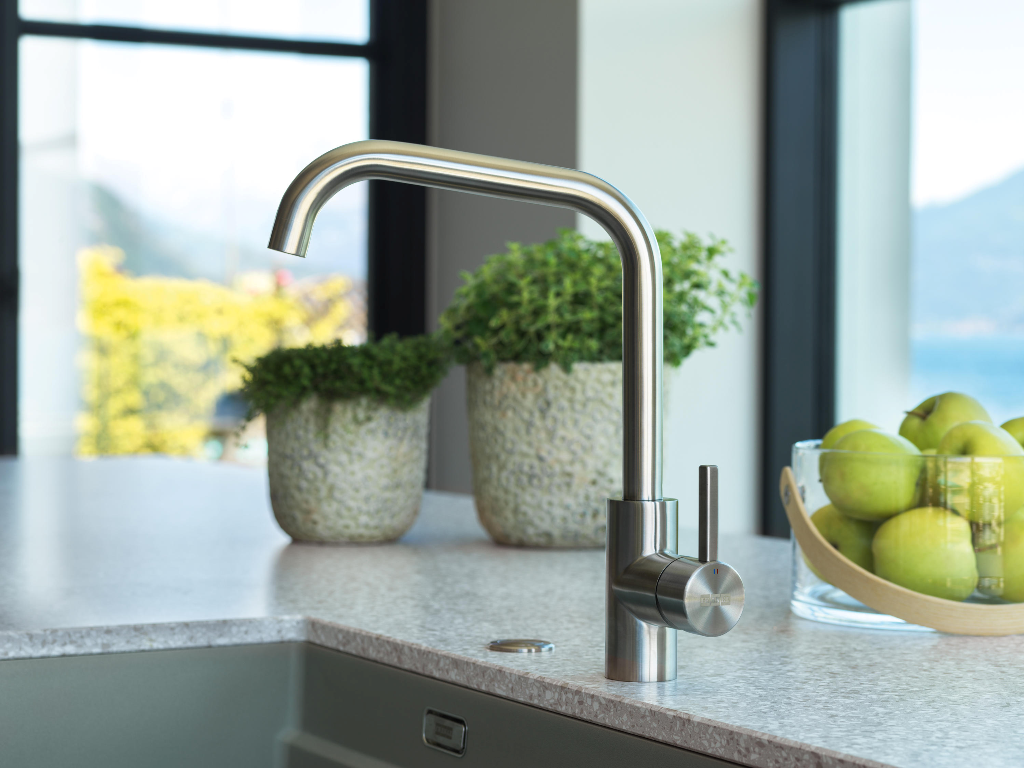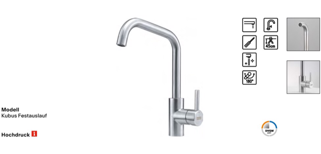 Einhebelmischer Kubus Festauslauf Hochdruck Perlator mit Laminarstrahl Material: Edelstahl massiv