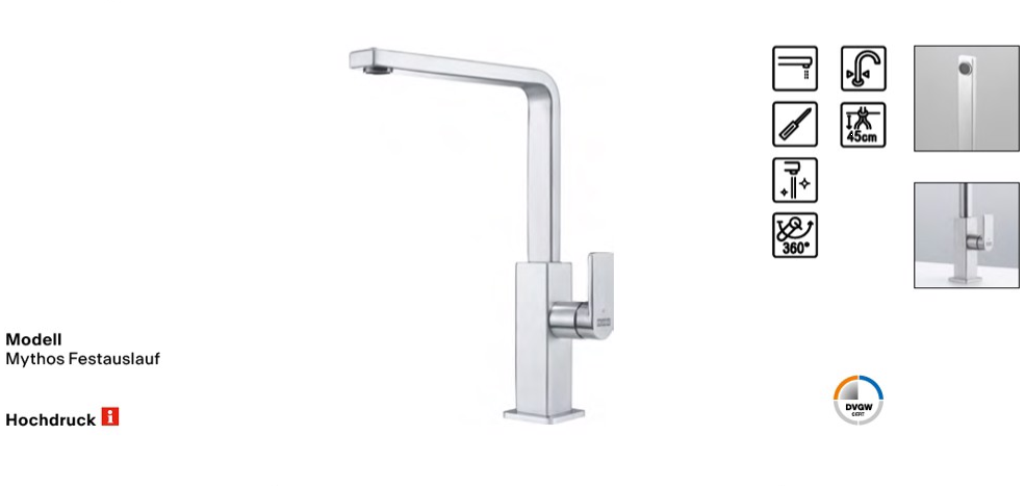 Einhebelmischer Mythos Festauslauf Hochdruck Perlator mit Laminarstrahl Material: Edelstahl massiv
