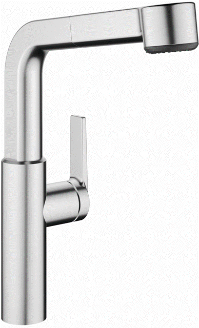 Einhebelmischer mit Zugauslauf und Brausefunktion Oberfläche: Edelstahl massiv mit schwenkbarem Auslauf