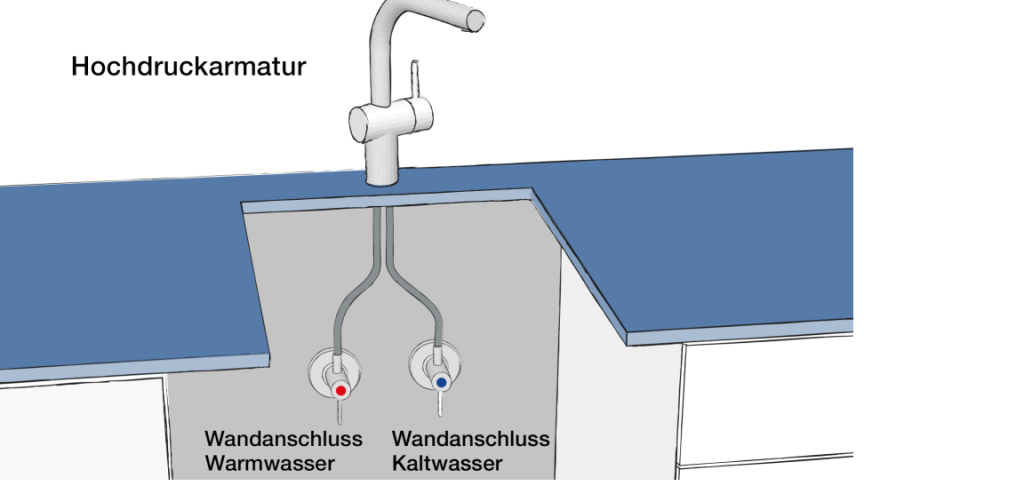 Liegen zwei getrennte Wasserleitungen für kaltes und warmes Wasser in Ihrer Wohnung an, wird warmes Wasser zentral über eine Warmwasseraufbereitung oder die Heizung erwärmt. Die Armatur wird über zwei Eckventile direkt an den Wandanschlüssen für kaltes und warmes Wasser angeschlossen. Im Unterschied zur Niederdruckarmatur benötigt eine Hochdruckarmatur keinen Boiler, um das Wasser zu erhitzen.