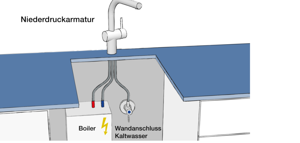 Niederdruckboiler funktionieren ohne Druck. Der Druck aus der Wasserleitung ist mit drei bis sechs Bar zu hoch. Strömt dieser in den Boiler, könnte das Gerät platzen. Niederdruckarmaturen lösen das!