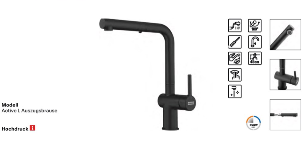 Einhebelmischer Active L Zugauslauf Hochdruck mit herausziehbarer Schlauchbrause Perlator mit Laminarstrahl Oberfläche: Fragranit+ Farben