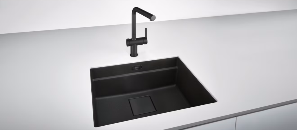 Granitspüle / Einbauspüle mit Drehknopfventil Black Matt - Black Collection für die flächenbündige Montage Küchenspüle aus Fragranit+ Außenmaße: 581.5x447.5mm