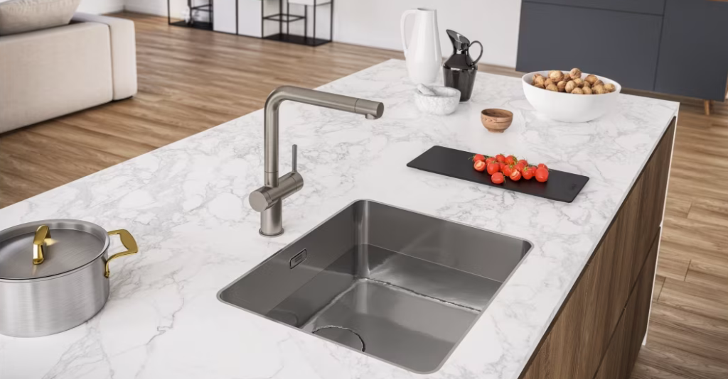 zur Montage in die Arbeitsplatte oder Spüle bequeme Druckbetätigung Oberfläche: Edelstahl Finish