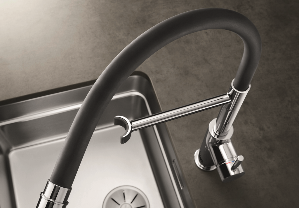 BLANCO CATRIS ist eine semi-professionelle Armatur in klassischer Gestaltung, die leidenschaftliche Hobbyköche begeistert. Die Chrom-Armatur präsentiert sich mit zahlreichen praktischen Features: Der flexible Hochdruck-Auslauf ist von einer Edelstahlfeder umgeben und verfügt über eine bewegliche und leicht abnehmbare