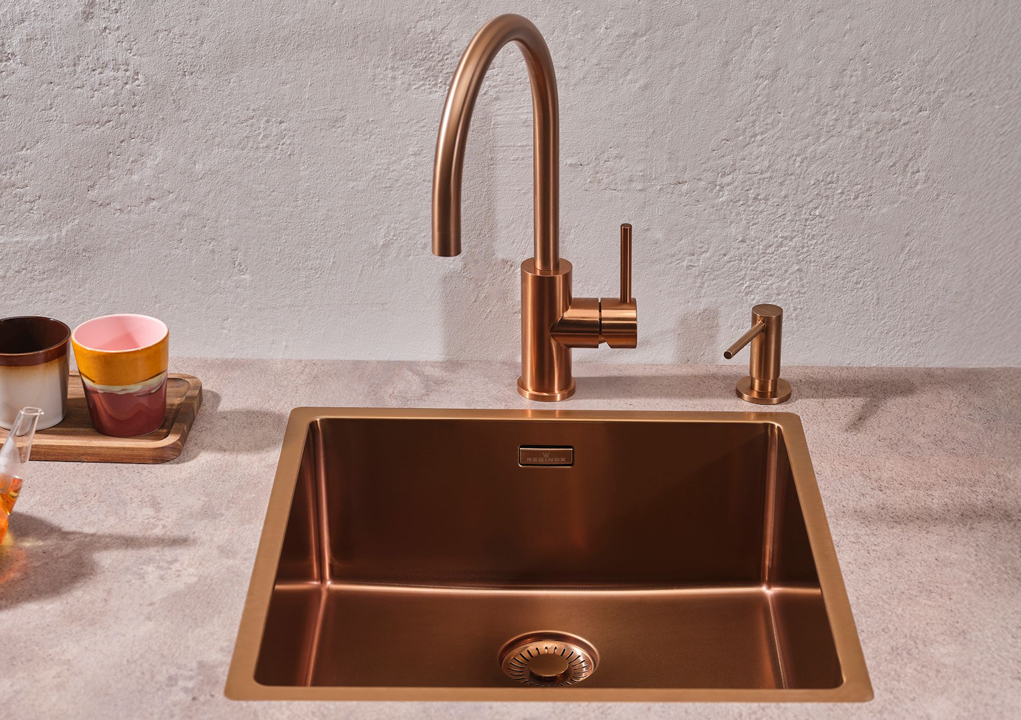 In den Farben Gun Metal, Copper und Gold. Die Reginox Armaturen der Serie Cano und Crystal vervollständigen ihre Küche.