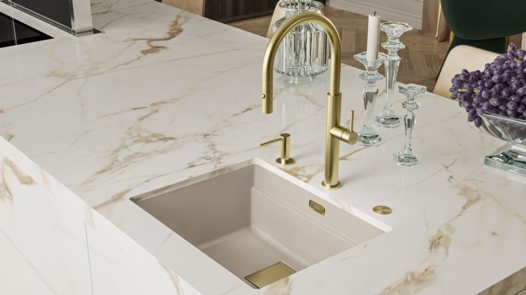 Einhebelmischer Pescara J Auszugsbrause Hochdruck mit 2-Strahl Brausefunktion / Laminar- und Brausestrahl Material: Edelstahl massiv Oberfläche: Gold