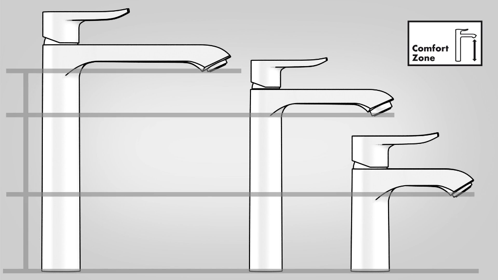 Viel Bewegungsfreiheit am Waschbecken, höchste Bedienfreundlichkeit und weniger Wasserspritzer: Die hansgrohe ComfortZone bietet Ihnen gleich mehrere Vorteile. Sie zeigt Ihnen an, wie viel Platz Sie zwischen Armaturenauslauf und Waschbecken haben. Mit der ComfortZone finden Sie den passenden Mischer für das Händewaschen, Haarewaschen oder Befüllen hoher Gefäße.