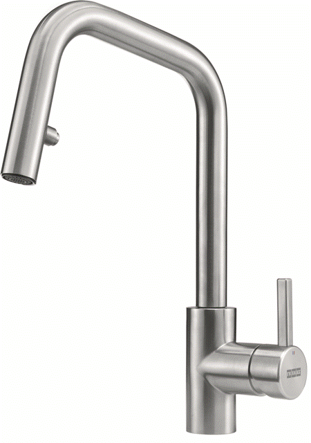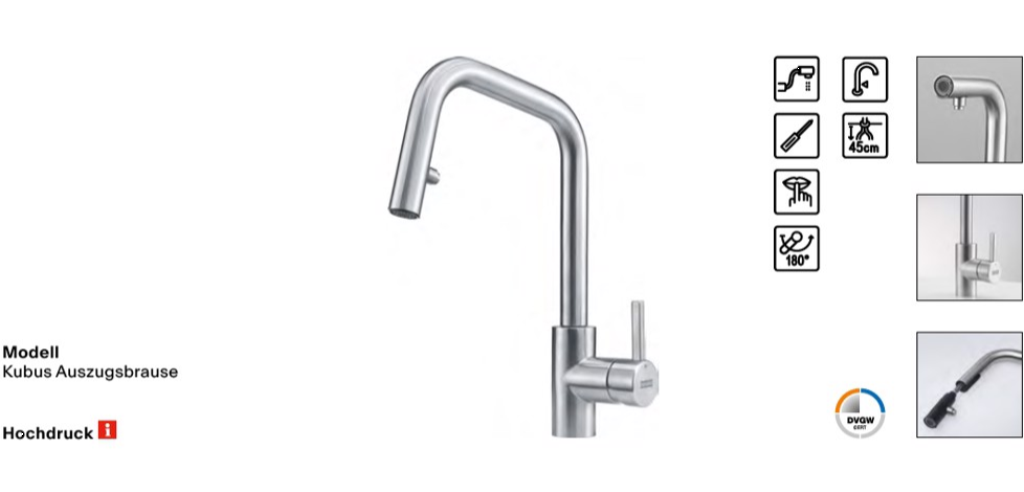 Einhebelmischer Kubus Zugauslauf Hochdruck mit herausziehbarer Auszugsbrause Material: Edelstahl massiv