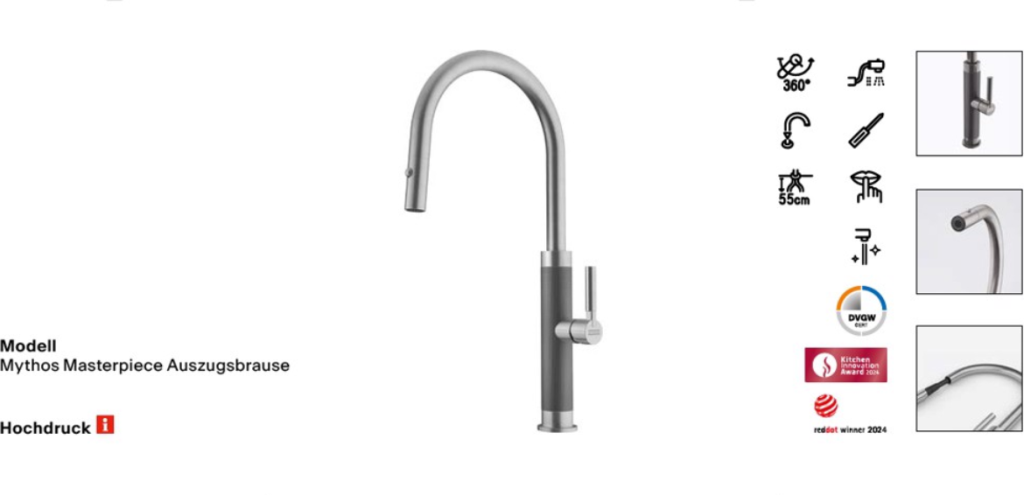 Einhebelmischer Mythos Masterpiece Zugauslauf Hochdruck mit herausziehbarer Auszugsbrause Material: Edelstahl massiv