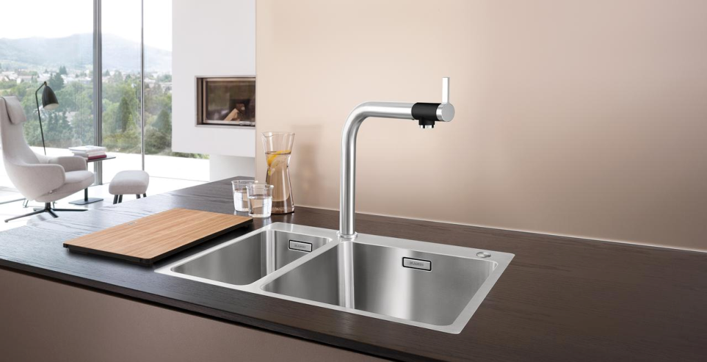 . In gebürstetem Edelstahl oder Chrom passt die Küchenarmatur BLANCO VONDA ideal zu flachbündigen Einzel- und Doppelbecken.