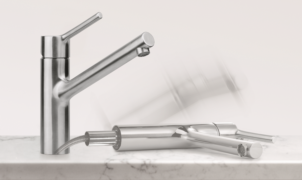 Einhebelmischer mit Pendelbrause mit schwenkbarem Auslauf Oberfläche: Edelstahl massiv