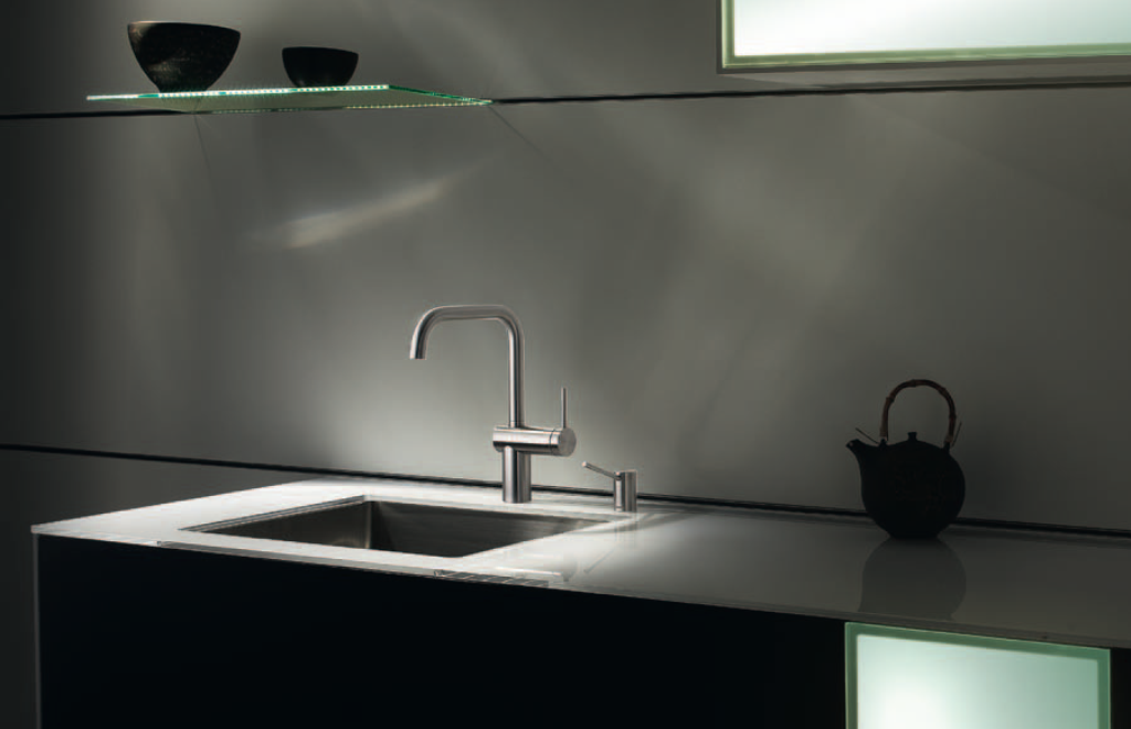 Einhebel-Küchenarmatur mit Festauslauf Hochdruck Griff rechts oder links positionierbar Kartusche mit Keramikscheiben Oberfläche: Edelstahl Finish