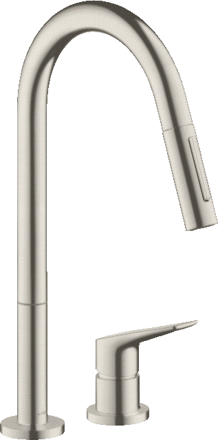 Einhebel-Küchenarmatur mit Zugauslauf Hochdruck mit Ausziehbrause und 2-Strahlarten Laminar-und Brausestrahl Griff rechts oder links positionierbar Oberfläche: Edelstahl Finish