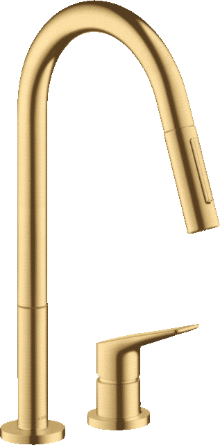 Einhebel-Küchenarmatur mit Zugauslauf Hochdruck mit Ausziehbrause und 2-Strahlarten Laminar-und Brausestrahl Griff rechts oder links positionierbar Oberfläche: Brushed Gold Optic