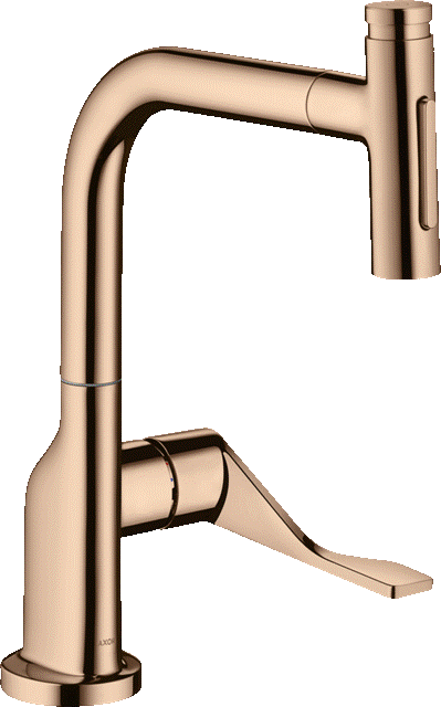 Einhebel-Küchenarmatur mit Zugauslauf Hochdruck mit Ausziehbrause und 2-Strahlarten Laminar-und Brausestrahl mit Select-Knopf sBox für eine leise, leichtgängige und geschützte Schlauchführung im Unterschrank Oberfläche: Polished Red Gold