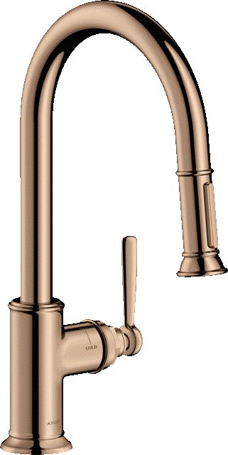 Einhebel-Küchenarmatur mit Zugauslauf Hochdruck mit Ausziehbrause und 2-Strahlarten Laminar-und Brausestrahl Oberfläche: Polished Red Gold