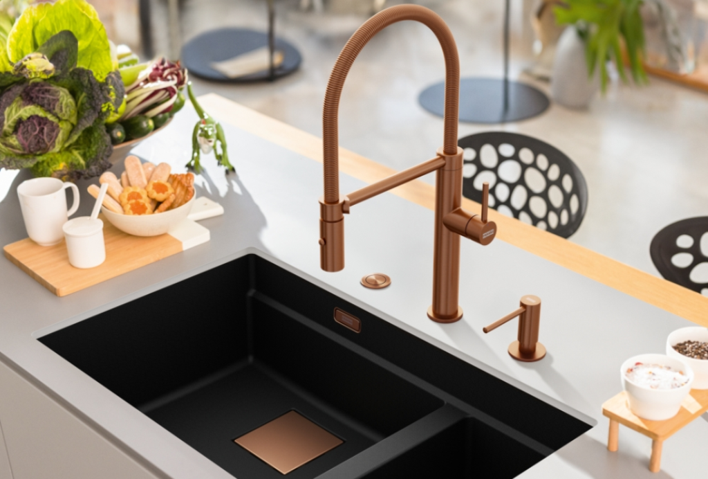 Einhebelmischer Pescara J Semi Pro Hochdruck mit flexibler Schlauchbrause und Magnethalterung Material: Edelstahl massiv Oberfläche: Copper