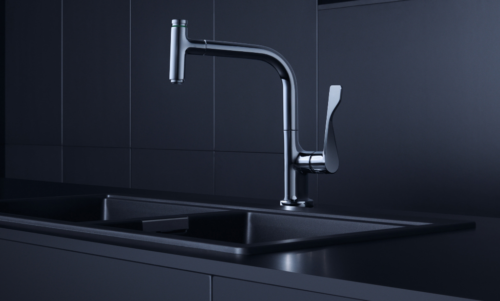 Einhebelmischer mit Zugauslauf Hochdruck Bedienung durch Sensor-Technologie mit herausziehbarer Schlauchbrause Oberfläche: Edelstahl Massiv