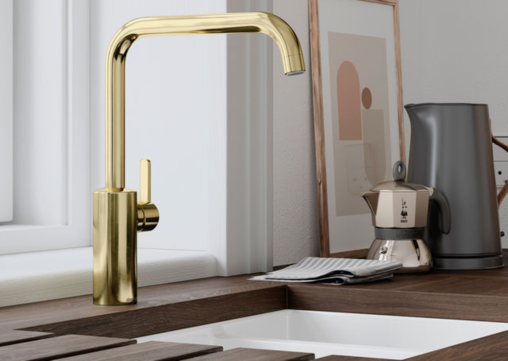Einhebelmischer / Küchenarmatur Hochdruck Auslauf 120° schwenkbar Oberfläche: Edelmessing poliert