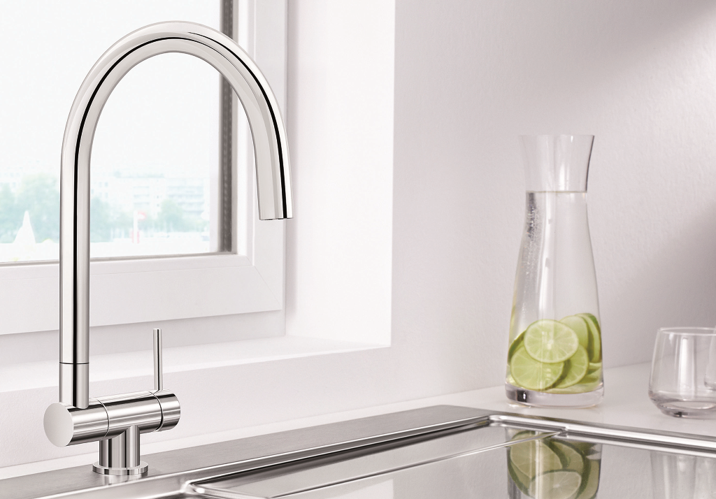 An einem Fensterplatz zu arbeiten ist auch in der Küche von großem Vorteil. Mit einem Armaturenprogramm zum Vorfenstereinbau, bietet BLANCO optimale Lösungen für Spülen mit Blick nach draußen an. Die moderne Vorfenster-Armatur.CORESSA ist mit einer komfortablen Klappmechanik ausgestattet. Mit nur einer Bewegung lässt sie sich in Sekundenschnelle einklappen und in das Becken absenken. So können Sie das Fenster schnell und weit öffnen, da der Auslauf komplett ins Becken abtaucht. Im umgeklappten Zustand ist der Aufbau der Armatur nur noch 6,5 cm hoch. Ein hörbares Einrasten am oberen und unteren Anschlag, ist ein sicheres Zeichen dafür, dass sich die Armatur wieder in voll funktionsfähiger Position befindet. Besonders praktisch ist auch der seitliche Bedienhebel, wählbar in Links- oder Rechtsausführung sowie der hohe Auslauf der.CORESSA, der einfaches Befüllen von hohen Gefäßen garantiert. Dank dieser komfortablen Technik genießen Sie ein völlig neues Gefühl an der Spüle bei weit geöffnetem Fenster.