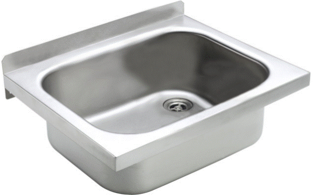 Wandausgussbecken für Wandmontage, aus Chromnickelstahl, Oberfläche seidenmatt, Materialstärke 1,0 mm, fugenlos eingeschweißtes Becken, abgerundete Kanten, ohne Klapprost, mit Siebablaufventil G 1 1/2 B, Ablauf hinten rechts, mit hinterer Aufkantung 40 mm (H), inklusive Befestigungsmaterial.
