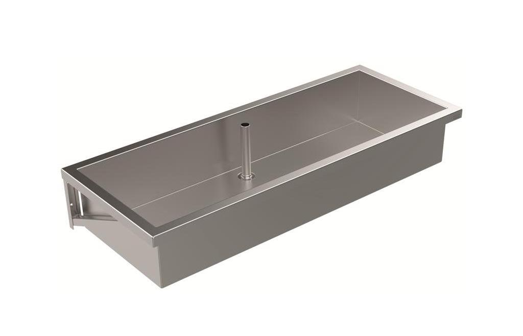 Unser gekantetes und geschweißtes Arbeits-/Mehrzweckbecken aus Edelstahl Werkstoff 1.4301, mit einer Materialstärke von 1,5 mm, besteht aus: Becken mit umlaufendem Rand 45mm und Abkantung 40mm nach unten. Der Beckenboden hat ein eingearbeitetes Gefälle zum Ablauf hinten mittig selbstdichtendem Standrohrventil 1 ½" aus Edelstahl stabile U-Profil-Wandkonsolen aus 2mm dickem Edelstahl