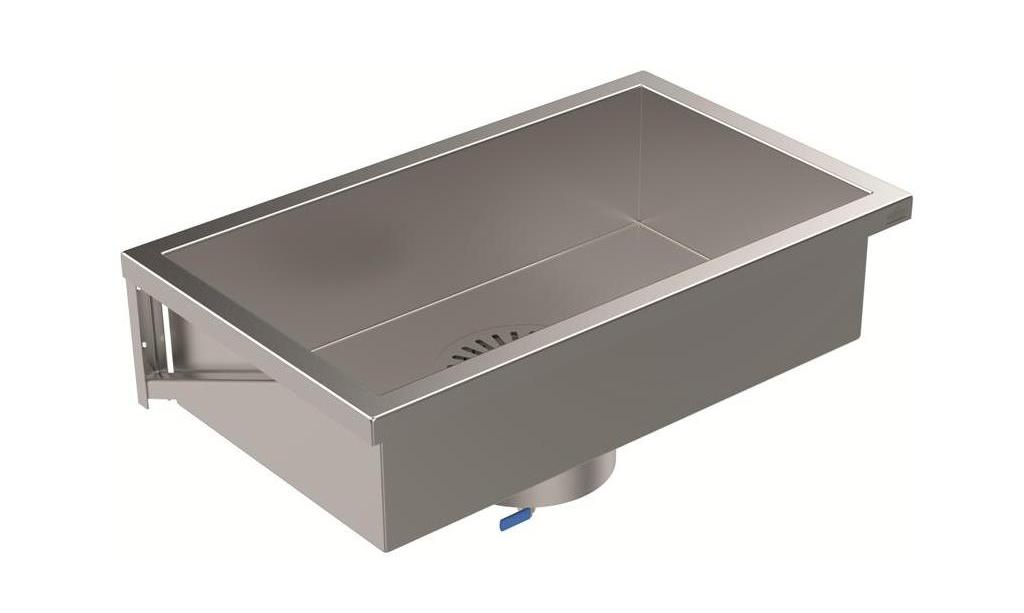 Unser wandhängendes Arbeits-/ Mehrzweckbecken, gefertigt aus Edelstahl Werkstoff (gekantet und geschweißt) 1.4301 mit einer Materialstärke 1,5 mm, besteht aus: 1 Becken mit umlaufendem Rand 45mm und Abkantung 40mm nach unten. Der Beckenboden hat ein eingearbeitetes Gefälle zum Ablauf mittig. 1 Schlammfangbehälter aus Edelstahl untergeschraubt und abgedichtet zum Becken mit herausnehmbarem Siebeimer als Schlammfang, mit integriertem Geruchverschluß. Abgang waagerecht DN 50 nach rechts (andere Ablaufrichtung auf Wunsch möglich und bei Bestellung bitte angeben!) unten am Schlammfangbehälter mit einem Kugelhahn für Reinigungszwecke. 2 stabile U-Profil-Wandkonsolen aus 2 mm dickem Edelstahl.