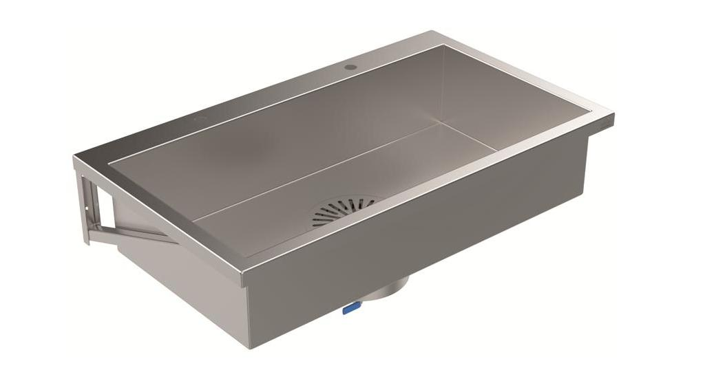 Unser wandhängendes Arbeits-/ Mehrzweckbecken, gefertigt aus Edelstahl Werkstoff (gekantet und geschweißt) 1.4301 mit einer Materialstärke 1,5 mm, besteht aus: 1 Becken mit umlaufendem Rand 45mm und Abkantung 40mm nach unten. 1 Becken mit 3-seitigem Rand 45mm und Abkantung 40mm nach unten sowie einer hinteren 100mm breiten Hahnbank (Anzahl, Position und Größe der.Hahnlochbohrungen auf Wunsch). Der Beckenboden hat ein eingearbeitetes Gefälle zum Ablauf mittig. 1 Schlammfangbehälter aus Edelstahl untergeschraubt und abgedichtet zum Becken mit herausnehmbarem Siebeimer als Schlammfang, mit integriertem Geruchverschluß. Abgang waagerecht DN 50 nach rechts (andere Ablaufrichtung auf Wunsch möglich und bei Bestellung bitte angeben!) unten am Schlammfangbehälter mit einem Kugelhahn für Reinigungszwecke. 2 stabile U-Profil-Wandkonsolen aus 2 mm dickem Edelstahl.