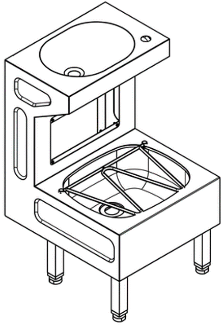 Standausguss - Waschtischkombination, freistehend oder Wandmontage, Chromnickelstahl, Oberfläche seidenmatt, Materialstärke 1,2 mm, Waschbecken ohne Überlauf, Ablauf mittig hinten, mit Siebventil G 1 1/4 B, mit Armaturenbohrung vorn rechts 35 mm geeignet für den medizinischen Bereich