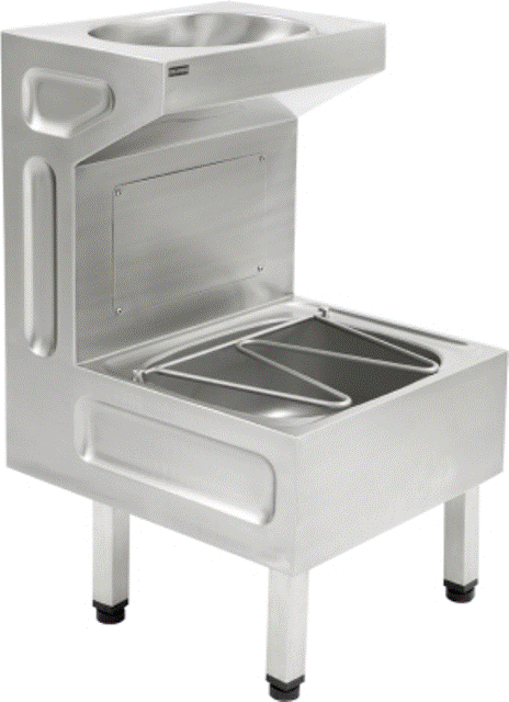 Ausgussbecken-, Waschtischkombination, freistehend oder zur Wandmontage, Chromnickelstahl, Oberfläche seidenmatt, Materialstärke 1,2 mm, Waschtischbecken mit Muldenmaß 360x272x135 mm, ohne Überlauf, G 1 1/4 Siebventil, inkl. Armaturenbohrung oben rechts, Ausgussbecken mit Muldenmaß 420x350x180 mm und umlaufendem Schwallrand, G 1 1/2 Haubenventil, Ablauf mittig, inkl. Edelstahl Klapprost mit Anschlagpuffer, abschraubbare Inspektionsöffnung, Füße höhenverstellbar.