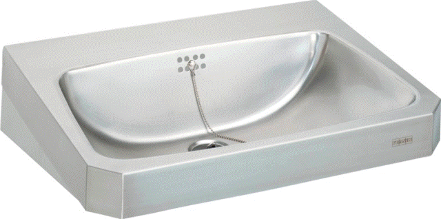 Einzelwaschtisch für Wandmontage, Chromnickelstahl, Oberfläche seidenmatt, Materialstärke 1 mm, fugenlos eingeschweißtes Becken mit Muldenmaß 550x350x145 mm, rechteckige Waschtischform, 90 mm Armaturenbank , mit Armaturenbohrung 35mm, mit Überlauf, 1 1/4" Stopfensieb, Ablauf hinten mittig, Frontpaneel mit 45° Ecken, mit eingeschweißten Wandkonsolen, Abstand zwischen den Achsen der Befestigungslöcher lt. EN 31, inkl. Schrauben und Dübel.