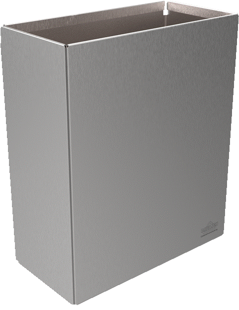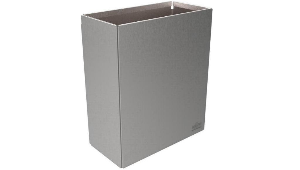 Unser klassischer Abfallbehälter ohne Deckel aus Edelstahl Werkstoff 1.4301, mit einer Materialstärke von 1 mm. Die gekantete und geschweißte Konstruktion mit umgefalztem Rand und Aufnahmevorrichtung für Abfallbeutel, ist oben offen und zur Montage an die Wand (Befestigungsmaterial ist inklusive). Die Oberfläche ist fein matt gebürstet und der Boden mit Öffnungen zum Ausspritzen geeignet.