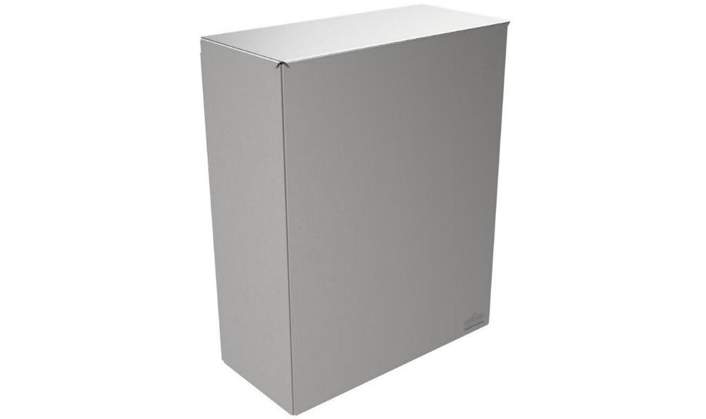 Unser klassischer Abfallbehälter mit Deckel aus Edelstahl Werkstoff 1.4301, mit einer Materialstärke von 1 mm. Die gekantete und geschweißte Konstruktion mit umgefalztem Rand und Aufnahmevorrichtung für Abfallbeutel, ist oben offen und zur Montage an die Wand (Befestigungsmaterial ist inklusive). Die Oberfläche ist fein matt gebürstet und der Boden mit Öffnungen zum Ausspritzen geeignet.