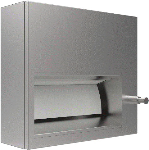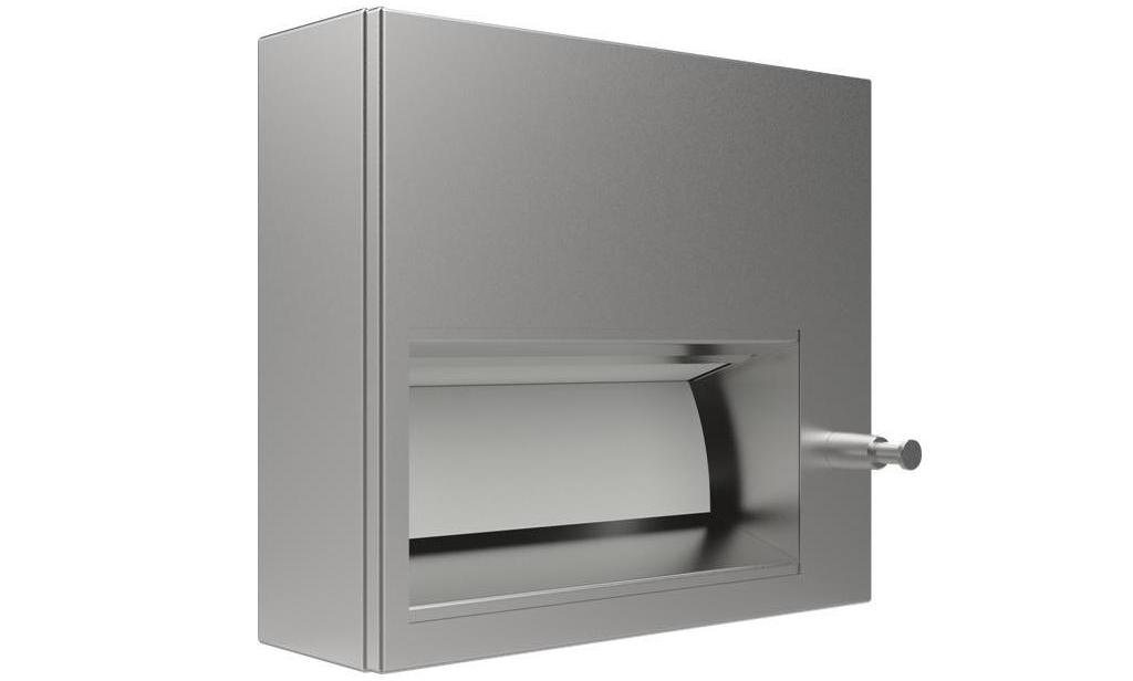 Papierhandtuchspender-Seifenspender-Kombination mit Eingrifföffnung 9120204M Serie Sirius II gefertigt aus Edelstahl Werkstoff 1.4301, Materialstärke 1 mm, gekantete und geschweißte Konstruktion, zur verdeckten Montage an die Wand, zur Auf- oder Unterputzmontage für ca. 250 handelsübliche Papierhandtücher, mit innenliegender Papierführung, Papierausgabekanten gerundet, dadurch keine Verletzungsgefahr, kombiniert mit Seifengeberventil aus Werkstoff-Nr. 1.4571 (V4A) Ausladung 60mm, Entnahme durch Drücken zur Verwendung mit externen bauseitigen Seifenvorratsbehältern Front als Tür Anschlag links mit verdeckten Spezial-Scharnieren ausgearbeitet, keine Nietenverbindungen, Tür austauschbar, mit Füllstandsschlitzen, Front mit nichtsichtbarem Schloss mittels verdeckt eingebautem Magnetschloss, Durch.Aufsetzen des Magnetschlossöffners (Best.-Nr.: 2007990002 ist extra zu bestellen!) auf die Front öffnet sich die Front zum Befüllen mit Papierhandtüchern Zum Schließen einfach zudrücken, Oberfläche fein matt gebürstet dadurch bessere und schnellere Reinigung, Laserschutzfolie komplett entfernt, dadurch Zeitersparnis bei der Montage und keine Folienränder/ansätze sichtbar einschl. Befestigungsmaterial Abm.: 350 x 320 x 120/180 mm