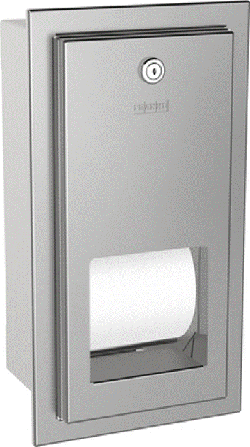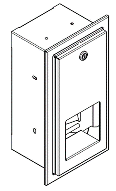 WC-Doppelrollenhalter mit Spindelsystem für Unterputzmontage, Chromnickelstahl, Oberfläche seidenmatt Materialstärke 0,8mm, geschlossenes Gehäuse mit gekanteter Front, Zylinderschloss mit Franke Einheitsschlüssel, für zwei Rollen bis maximal 120mm Durchmesser, Reserverolle fällt nach Verbrauch der ersten Rolle automatisch in Spenderposition, Reserverolle nicht sichtbar, inklusive Edelstahlschrauben und Dübel.
