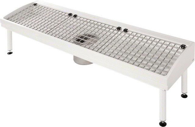 aus Chromnickelstahl. Ablaufkörper um jeweils 90° drehbar. Je Reinigungsplatz ein klappbarer Gitterrost aus Chromnickelstahl..Unterbau als Schweißkonstruktion, pulverbeschichtet in Beckenfarbe, Füße nivellierbar. Inklusive Befestigungsmaterial.