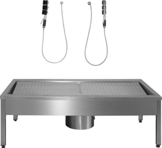 SIRIUS Schuh- und Stiefelreinigungsanlage zur Wandmontage, CNS, Materialstärke 1,2 mm, mit Vierkantfüssen 40 x 40 mm, Ablauf drehbar, Geräteanschlussventile G 1/2 B. 3 Reinigungsplätzen, inklusive Schlammfangeinsatz