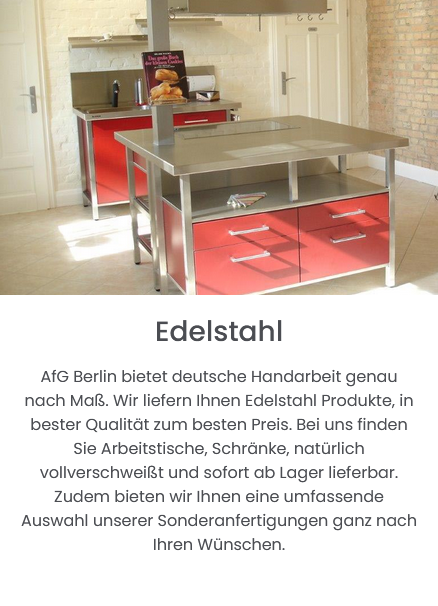 Arbeitsplatten werden im Standard aus Chromnickelstahl 1.4301 - 1 mm stark und fein geschliffen (Korn 320) gefertigt.Zusätzlich schalldämmend unterfüttert mit wasserabweisender Platte (Novopan V20) entsprechend der VDI 3907. Bei Abkantungen sind die Arbeitsplatten mit Tropfkante versehen. Auf Anfrage können die Arbeitsplatten auch aus 1,5/ 2,0 mm Chromnickelstahl sowie mit Hutprofilen schallgedämmt unterfüttert werden. Ab dieser Stärke können Einschweißbecken und Drop In Geräte wie Bain-Marie´s oder Kühlvitrinen eingebracht werden.