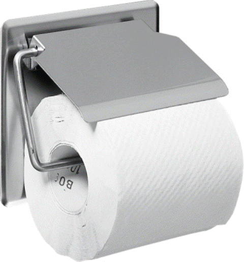 WC-Rollenhalter für Aufputzmontage, Chromnickelstahl, Oberfläche seidenmatt, Materialstärke 0,8 mm, mit Klappdeckel, für eine Rolle bis maximal 130 mm Durchmesser, inklusive Edelstahlschrauben und Dübel.