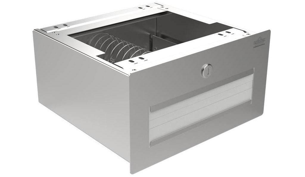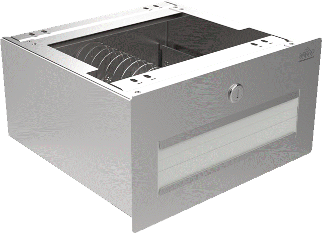 Ein weiterer Papierhandtuchspender aus dem Hause DREILICH dessen Spenderfach als Schublade ausgearbeitete ist und über eine Papierführung mit Federmechnaismus für den Vorschub der Papierhandtücher verfügt. Die gekantete und geschweißte Konstruktion aus Edelstahl Werkstoff 1.4301 mit einer Materialstärke von 1 mm hat eine fein matt polierte Oberfläche, eine flach aufliegende Front und wird verdeckt unter Waschtischplatten in die Frontschürze eingebaut. Die Front ist mit einem flachen Zylinderschloss mit Edelstahlblende abschließbar.
