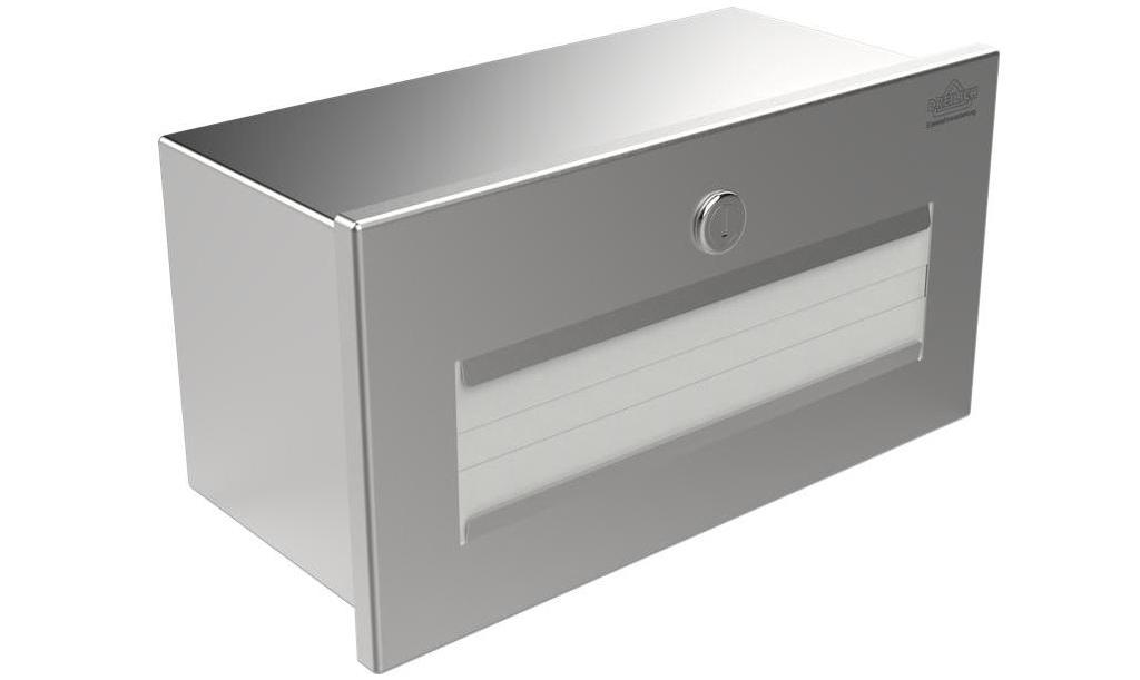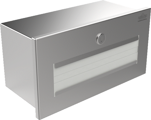 Dieser Papierhandtuchspender mit flachaufliegender Front und Papierausgabe von vorne wird verdeckt unter Waschtischplatten in die Frontschürze eingebaut. Das gekantete und geschweißte Gehäuse aus Edelstahl Werkstoff 1.4301 mit einer Materialstärke von 1 mm wird von vorne durch die ausfahrbare Spenderschublade befüllt und verfügt über innenliegende Gleitschienen und Papierführung mit Federmechanismus für den Vorschub der Papierhandtücher. Die Front ist mit einem flachen Zylinderschloss mit Edelstahlblende versehen.