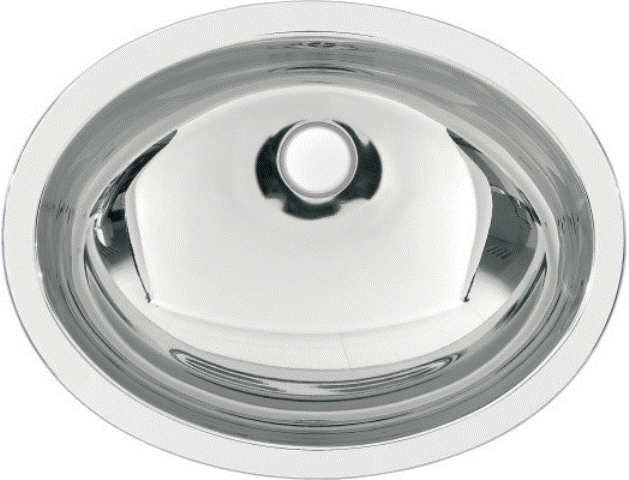 Becken oval, Chromnickelstahl, Oberfläche innen und außen hochglanzpoliert, Materialstärke 1 mm, Muldenmaß 450 x 330 (B x T) montierbar als Einlegebecken oder (Unterbaubecken), mit Überlauf und Ab- und Überlaufgarnitur G 1 1/4 B. Ohne Flach- und Stopfensieb, inklusive Edelstahlbügel für Einbau von unten.