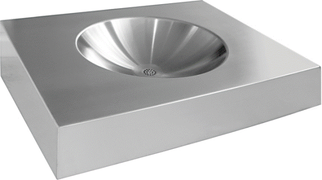 Einzelwaschtisch ANIMA für die Wandmontage fugenlos eingeschweißtes Rundbecken fugenlos eingebrachter Siebablauf Waschtisch unten geschlossen mit Revisionsklappe ohne Überlauf