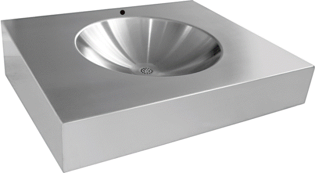 Einzelwaschtisch ANIMA für die Wandmontage fugenlos eingeschweißtes Rundbecken fugenlos eingebrachter Siebablauf Waschtisch unten geschlossen mit Revisionsklappe ohne Überlauf mit Armaturenbohrung