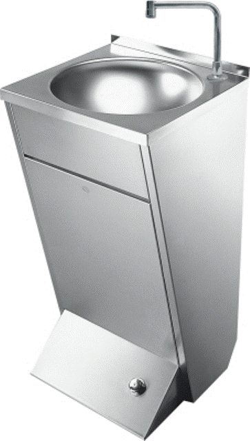 Einzelwaschtisch ANIMA für die Wandmontage fugenlos eingeschweißtes Rundbecken und vormontierten Wasserauslauf bodenstehende Siphon
