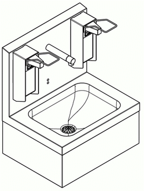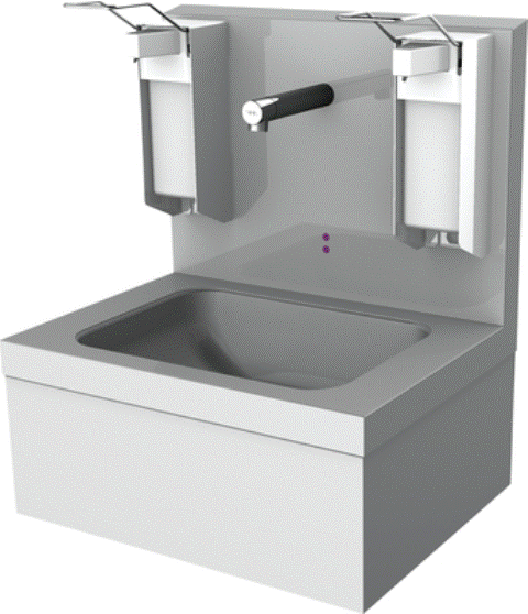 - mit zwei Armhebelspendern aus CNS (für Flüssigseife / für Desinfektionslösung, jeweils max 1 Liter)