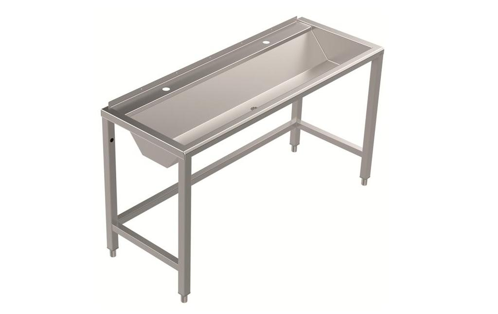 mit eingearbeiteter Armaturen-/Ablagebank zur Verwendung von Stand- oder Wandarmaturen Rinne gekantet mit eingearbeitetem Gefälle zum mittigen Ablauf mit integriertem Ablaufsieb und Ventilunterteil 1 ½“ mit 3-seitig abgekanteter 150 mm hoher Schürze mit.Unterbau bestehend aus 4 Füßen aus Vierkantrohr, Nivellierfüßen und einer unter dem Beckenrand umlaufenden Verstrebung und einer unteren 3-seitigen Verstrebung aus Edelstahl vierkantrohr