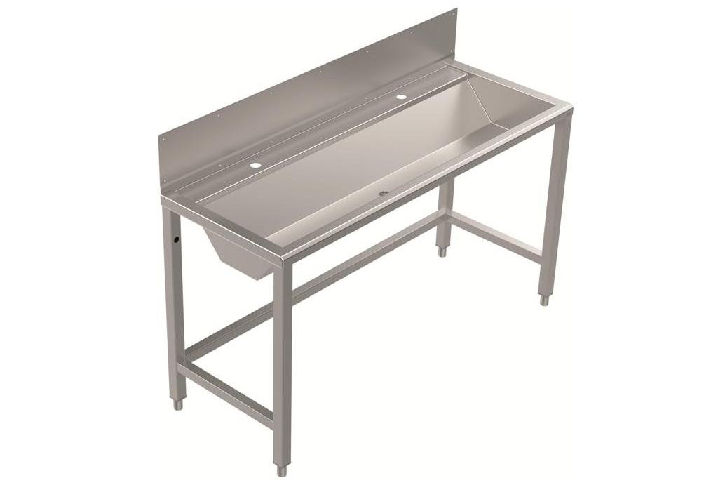 mit Spritzrückwand und eingearbeiteter Armaturen-/Ablagebank zur Verwendung von Stand- oder Wandarmaturen Rinne gekantet mit eingearbeitetem Gefälle zum mittigen Ablauf mit integriertem Ablaufsieb und Ventilunterteil 1 ½“ mit 3-seitig abgekanteter 150 mm hoher Schürze mit.Unterbau bestehend aus 4 Füßen aus Vierkantrohr, Nivellierfüßen und einer unter dem Beckenrand umlaufenden Verstrebung und einer unteren 3-seitigen Verstrebung aus Edelstahl vierkantrohr