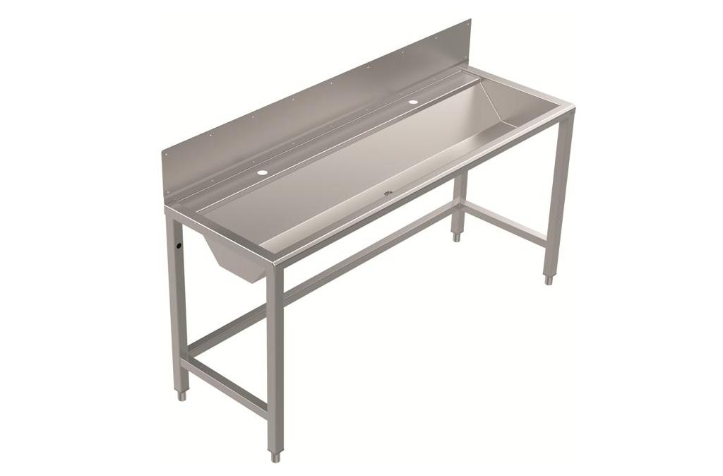 mit Spritzrückwand und eingearbeiteter Armaturen-/Ablagebank zur Verwendung von Stand- oder Wandarmaturen Rinne gekantet mit eingearbeitetem Gefälle zum mittigen Ablauf mit integriertem Ablaufsieb und Ventilunterteil 1 ½“ mit 3-seitig abgekanteter 150 mm hoher Schürze mit.Unterbau bestehend aus 4 Füßen aus Vierkantrohr, Nivellierfüßen und einer unter dem Beckenrand umlaufenden Verstrebung und einer unteren 3-seitigen Verstrebung aus Edelstahl vierkantrohr